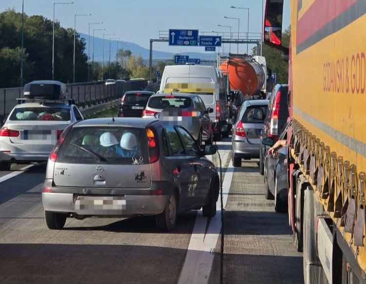 Távolabb, az ellenkező, Budapest felé vezető oldalon, a 102-es km-nél kigyulladt egy személyautó. Áll a forgalom.