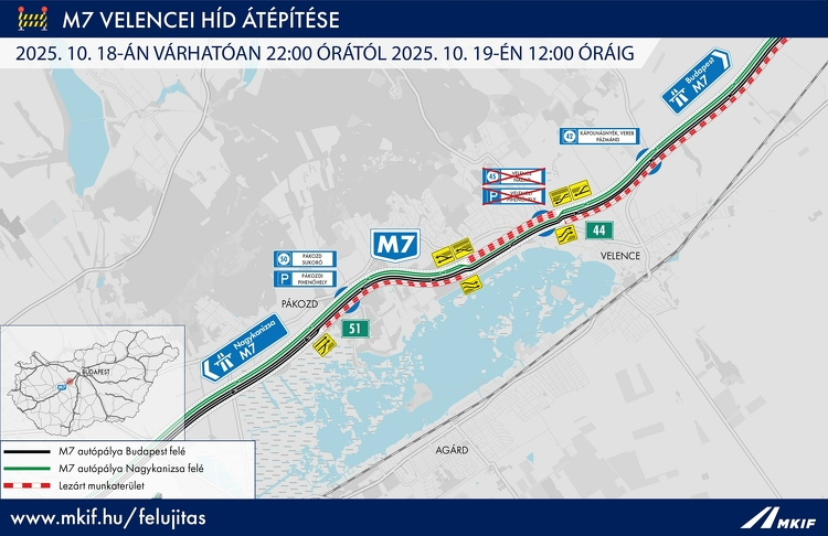 Szombaton, október 18-án 22 órától lezárják az M7-es autópálya Balaton felé vezető oldalát a 44-es és a 46-os km-ek között, várhatóan vasárnap délig. A lezárás oka, hogy beemelik az új, velencei gyalogos-kerékpáros híd további elemeit – derül ki az M7-est is kezelő MKIF Magyar Koncessziós Infrastruktúra Fejlesztő Zrt. Facebook-posztjából.