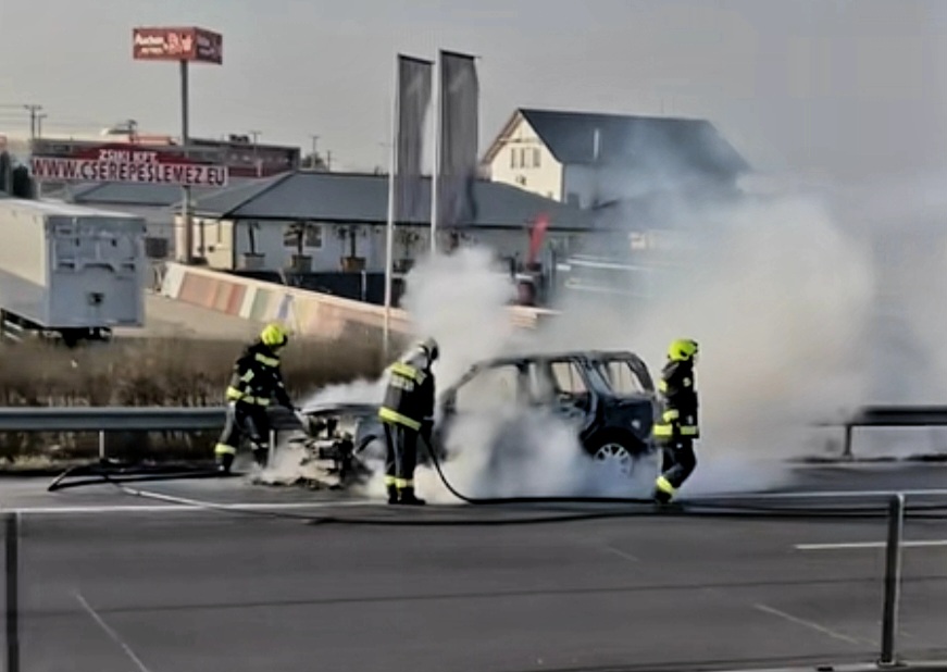 Kigyulladt egy személyautó a reggeli órákban az M0-s autóút szigetszentmiklósi szakaszán, az M5-ös sztráda felé vezető oldalon.