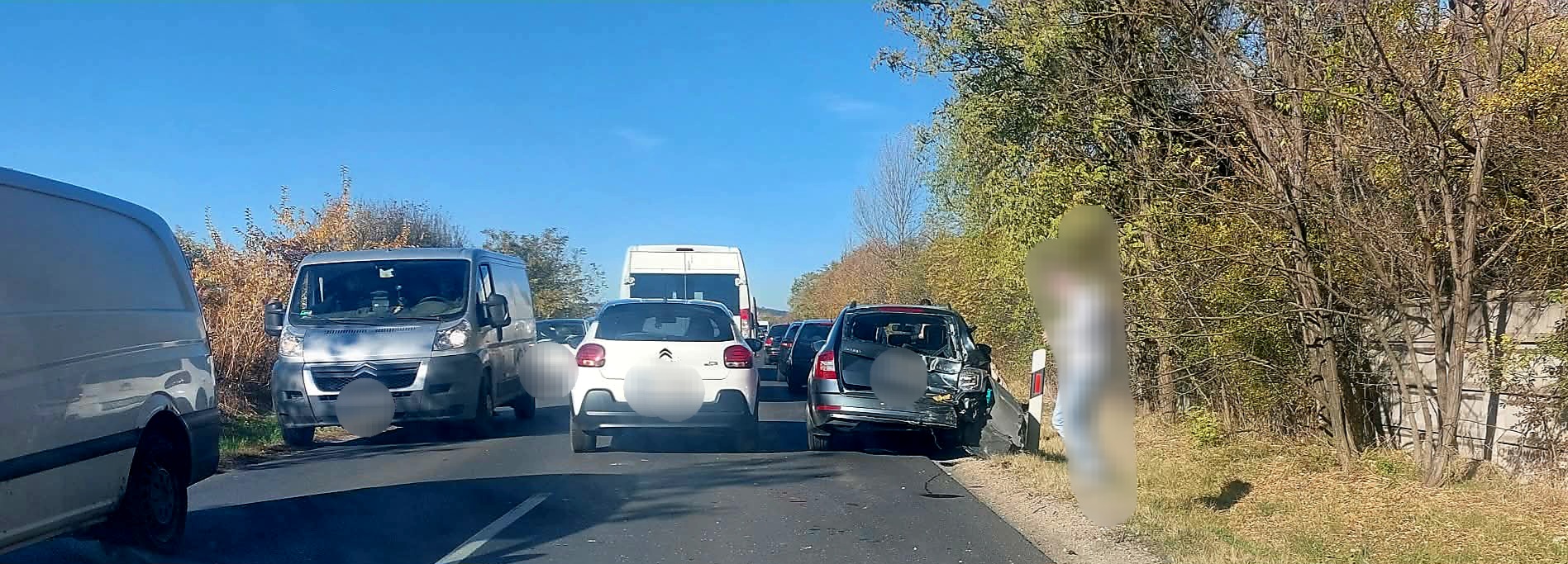 A 21-es főúton, Salgótarján átkelési szakaszán két személyautó ütközött össze. Az 56-os km-nél csak a fél útpálya járható.